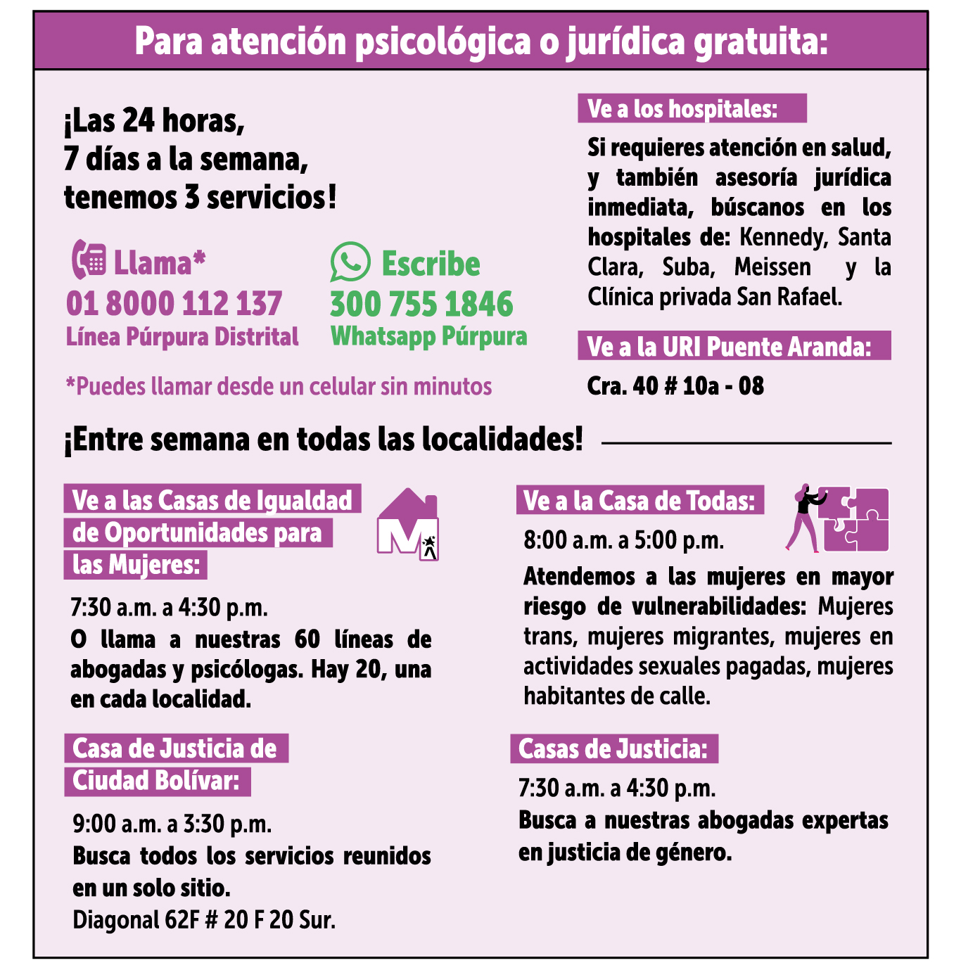 Encuentra todos estos servicios en las Manzanas del Cuidado y las Unidades Móviles del Cuidado - Llama para apartar tu cupo gratuito a todas estas actividades: Ciudad Bolívar: 312 5728269, Bosa: 300 5346355, San Cristóbal: 324 2850286, Usme: 311 8851845, Los Mártires: 350 7961716, Kennedy: 350 5071884.